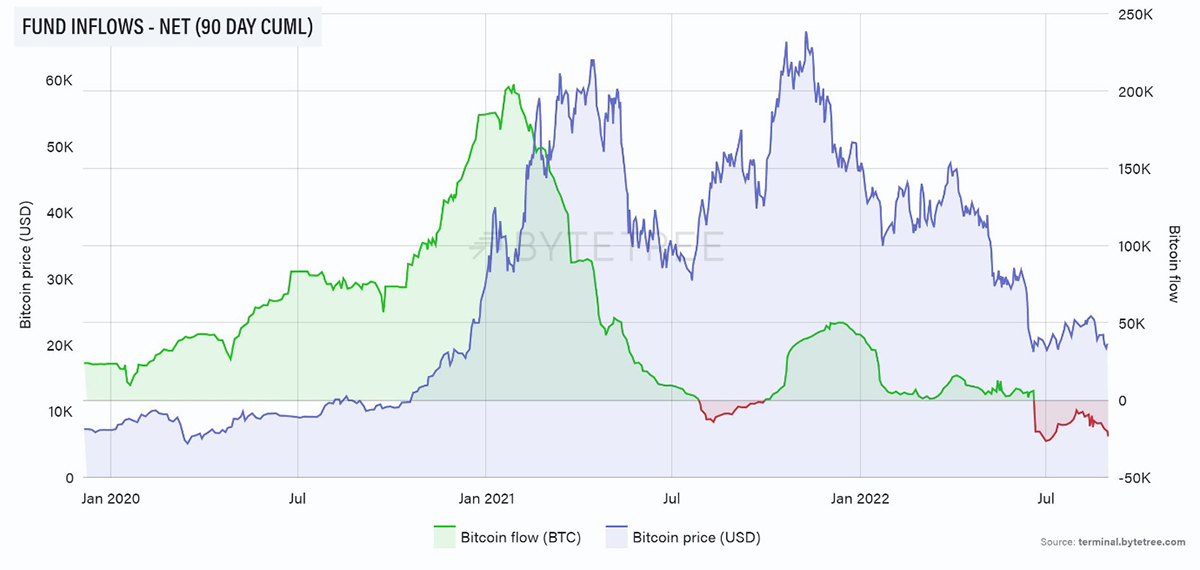 Source: ByteTree. Bitcoin net fund inflows (90-day cumulative) and the BTC price (USD), since January 2020.