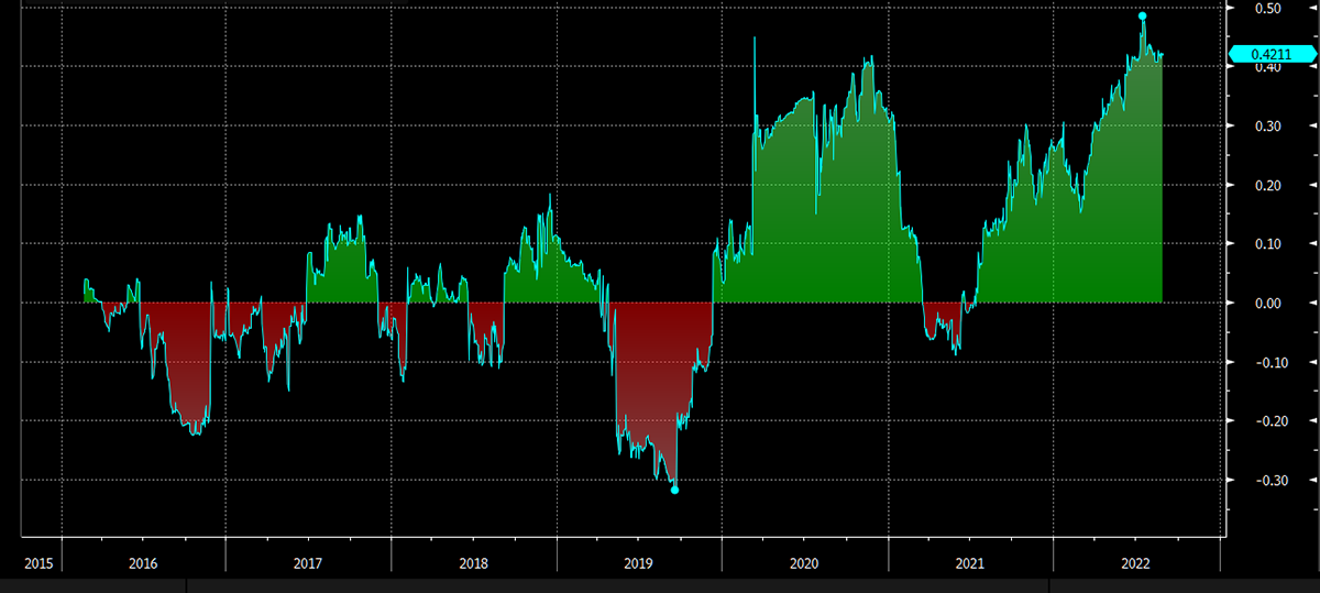 The 2-year bitcoin flows chart is arguably useful as a contraryindicator. The last period when it dipped into the red was in August 2021, which marked a great trading opportunity, but in truth, it’s hard to make a buy case based on this alone because the data series is so short. In early 2021 outflows were a useful leading indicator that the bull market was running out of steam. We really need to see flows going positive to establish a more constructive case for bitcoin on this metric.