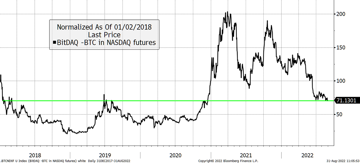 Looking at BitDAQ (bitcoin in NASDAQ), the two assets have seen the same return at all points along the green horizontal. In other words, bitcoin has enjoyed the same return as the NASDAQ since early 2018, mid-2019 and late 2020.