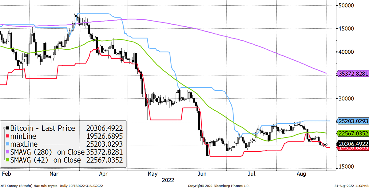 At ByteTree, we believe bitcoin is underpinned at the $20,000 level, but acknowledge that the trend is weak and the macro is harsh. What’s needed is peak macro carnage, which will ease correlations. At that point, bitcoin will be able to differentiate itself and find its own path.