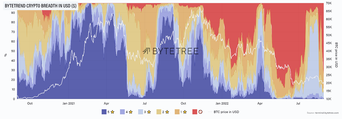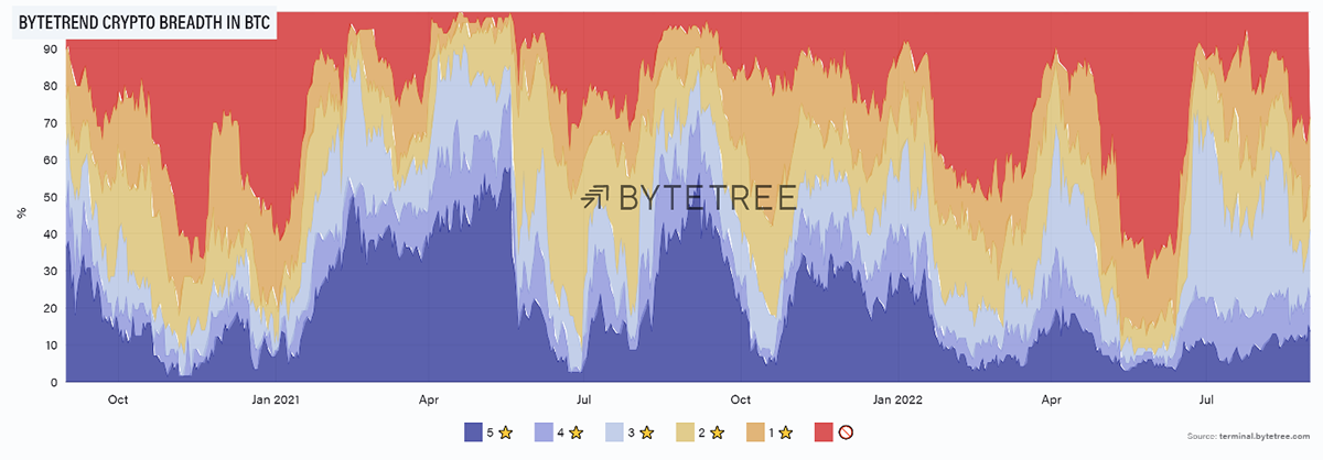 Source: ByteTree. ByteTrend crypto breadth chart, relative to BTC, since September 2020.