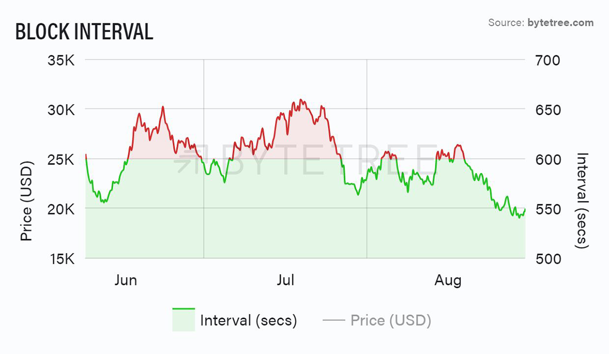 Source: ByteTree. Bitcoin Block Interval over the past 12 weeks.