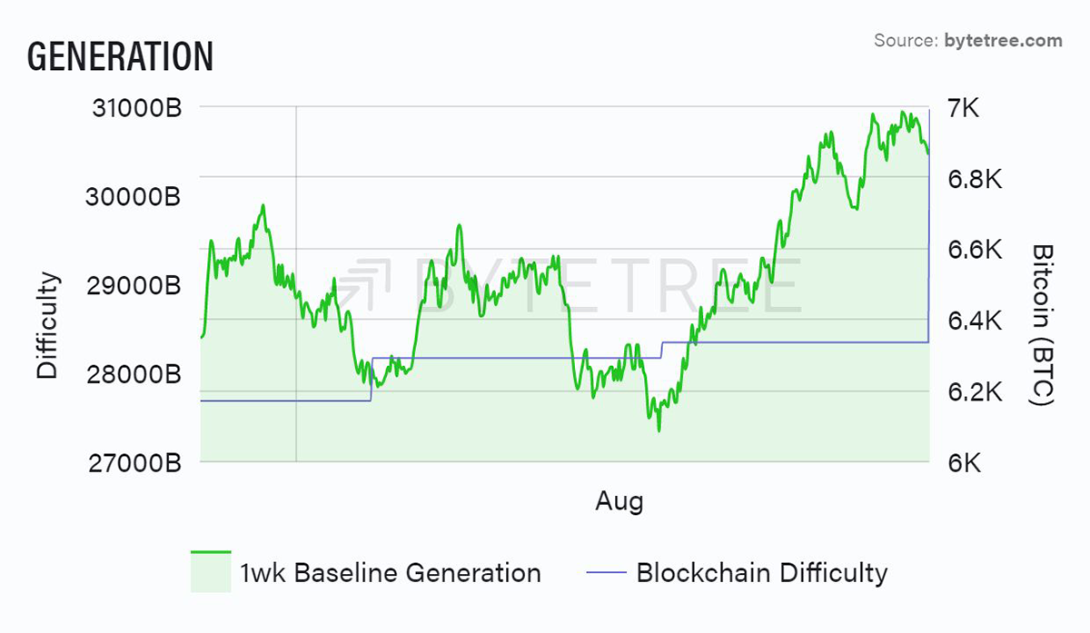 Source: ByteTree. Bitcoin Generation and difficulty over the past 5 weeks.
