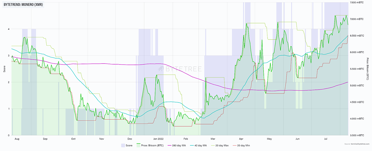 In the ByteTrend chart above, we can see that the XMR token had a steep drop in price in October 2021. The price continued to be suppressed towards the end of 2021, signifying that XMR is not highly correlated to Bitcoin, as Bitcoin hit its all-time high in the same period. As the crypto market collapsed in the first quarter of 2022, XMR culminated in explosive price action in April 2022 due to speculations discussed before. The XMR token is currently outperforming BTC, scoring a 5-star ByteTrend in BTC since mid-July 2022.