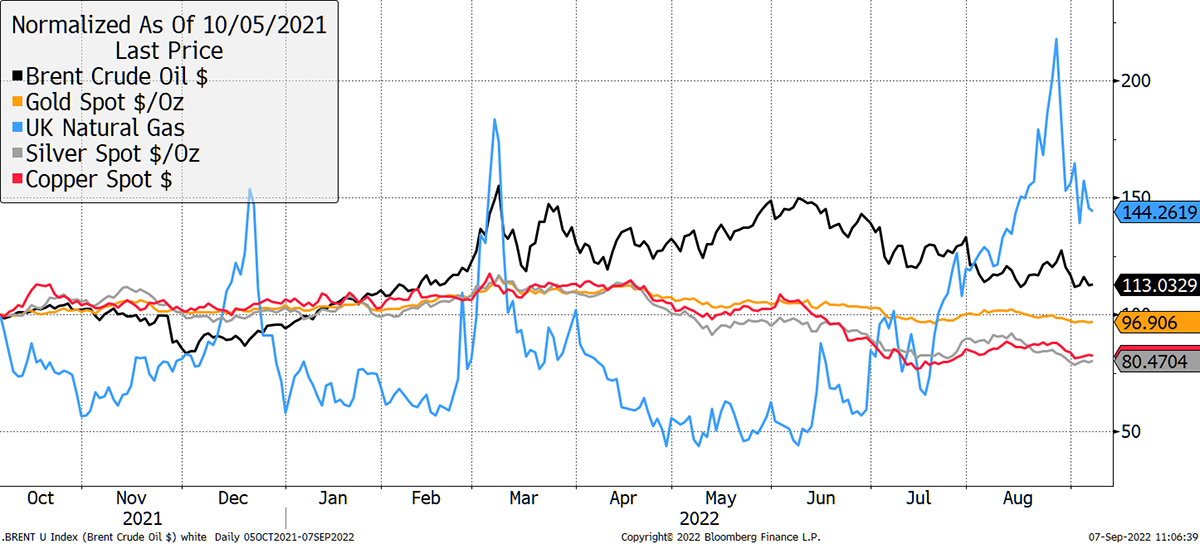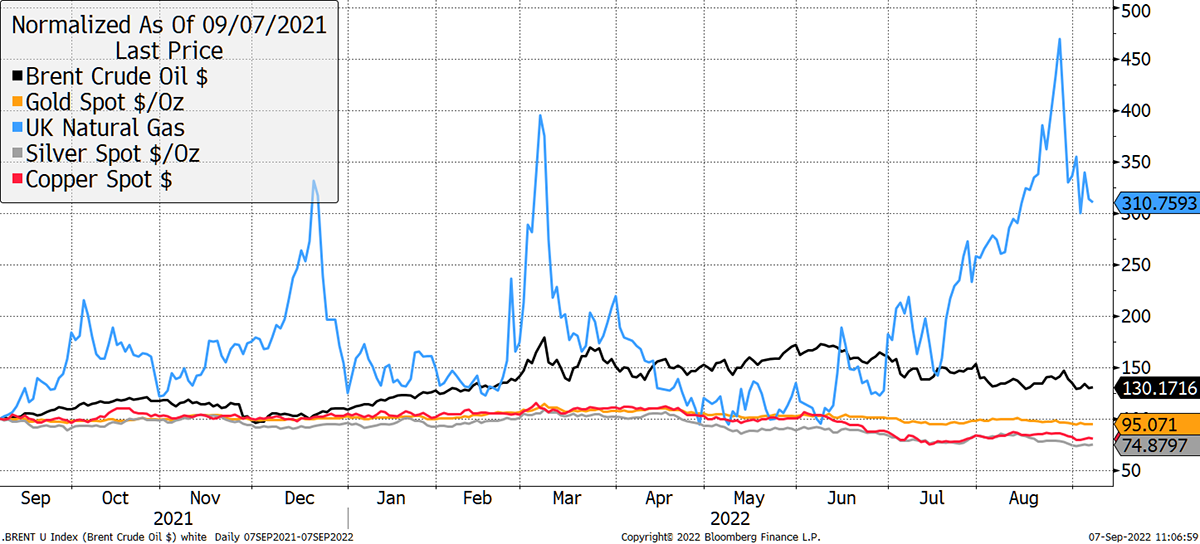 How can this be in the midst of a cost-of-living crisis? The main culprit in Europe has been the rising cost of natural gas, up 210% over the past year. Oil is 30% higher while gold, silver and copper are lower.