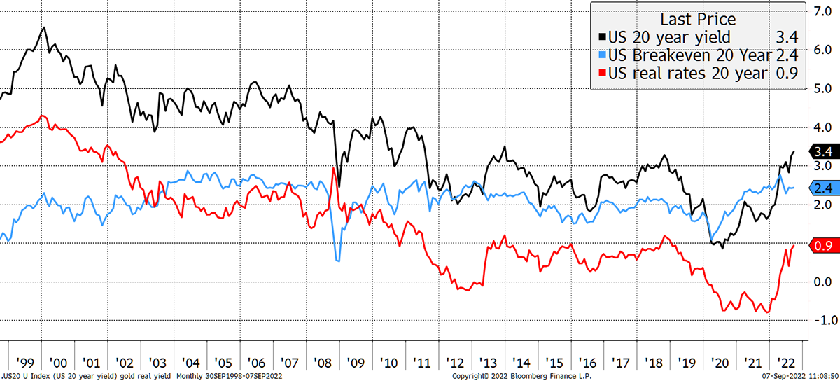 We soon see a peak in the bond yield at 3.5%, which is not far away from where we already are, but long-term inflation expectations fail to return to 2%. Instead, they rise to 3% and suddenly, gold trades at $1,931. This bullish scenario seems likely because the world has changed.