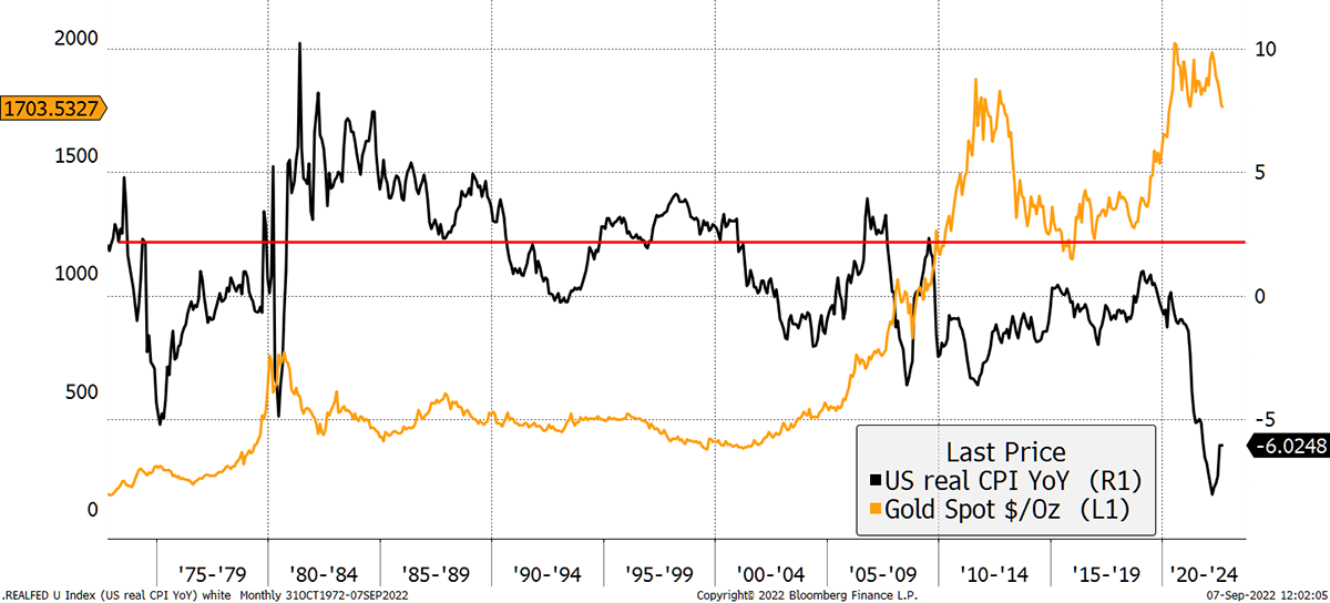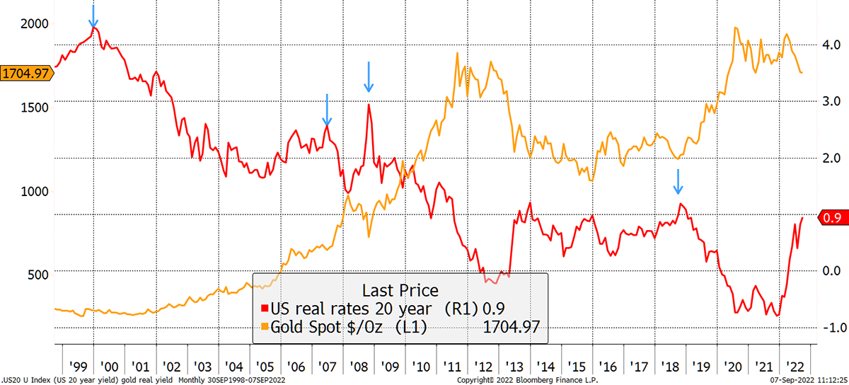 The first rule is well in the money as the current real interest rate (Fed interest rate 3% less last CPI 8.5%) is deeply negative. Historically a reading below 1.8% has tended to be onside for the gold price.