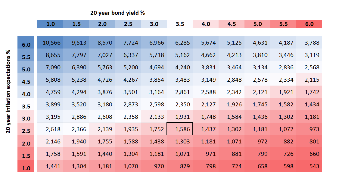 If we returned to rates in 2000, with inflation at 2% and the bond yield at 6%, gold would slump to around $801. The 2007 scenario sees inflation at 2.5% with a bond yield at 5%. Then expect gold to touch $1,181.