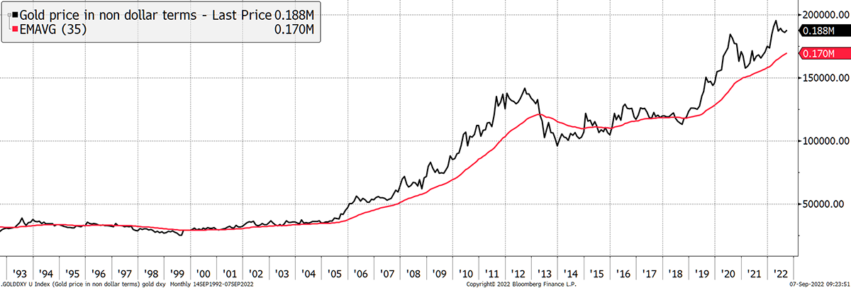 - The gold price, measured in a basket of currencies is rising, measured by a 35-month exponential moving average. TRUE
