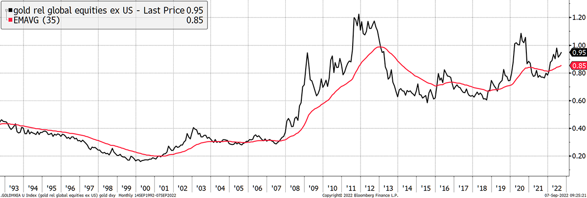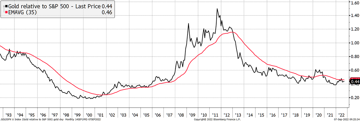 - The gold price relative to the S&P 500, measured by a 35-month exponential. CLOSE