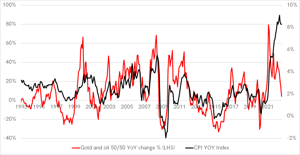 James Ferguson, from the Macro Strategy Partnership, has a theory that CPI can be forecast using the year-on-year change of a basket that is 50% oil and 50% gold. If so, inflation is already behind us. Not a bad record and plausible.