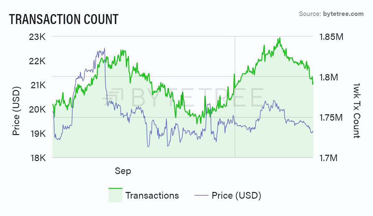 Source: ByteTree. The number of bitcoin transactions (green) and bitcoin price (blue) in USD, over the past 5 weeks.