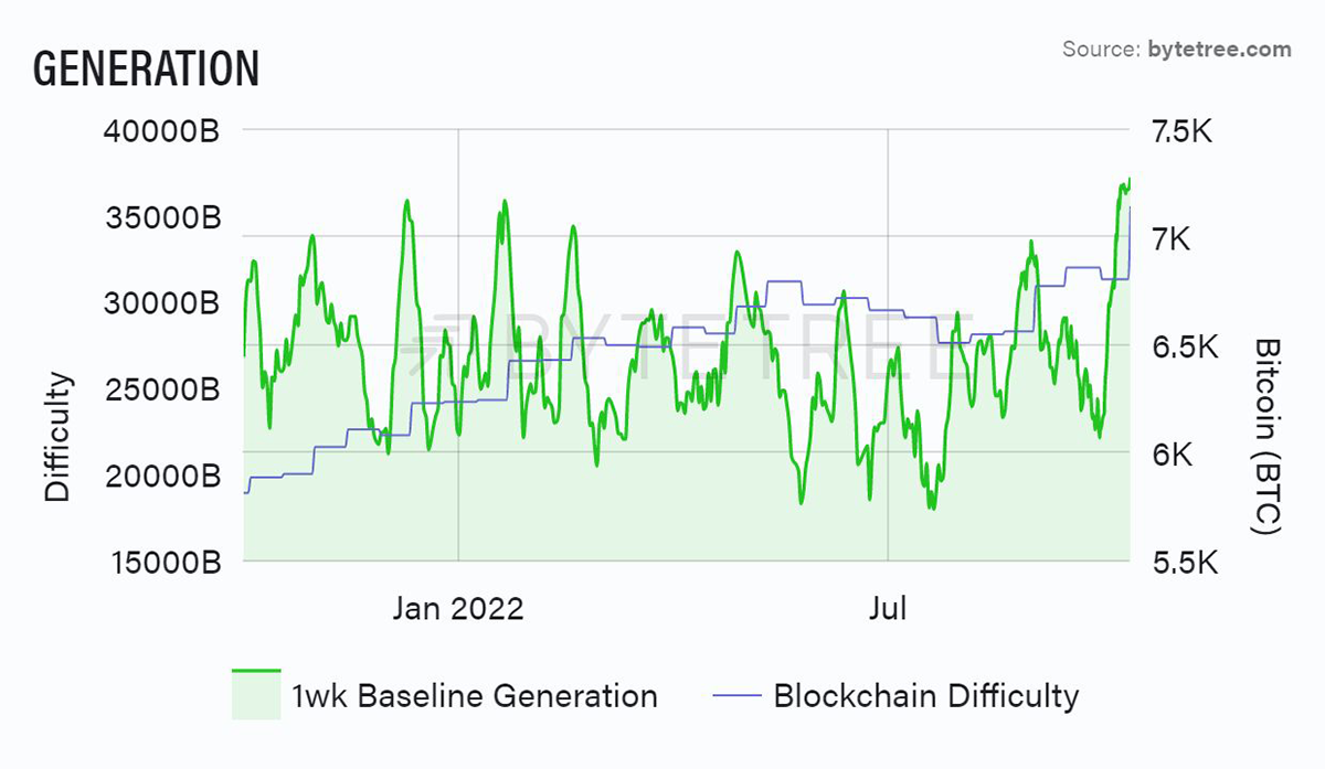 Source: ByteTree. New bitcoin generation (BTC) and blockchain difficulty over the past year.
