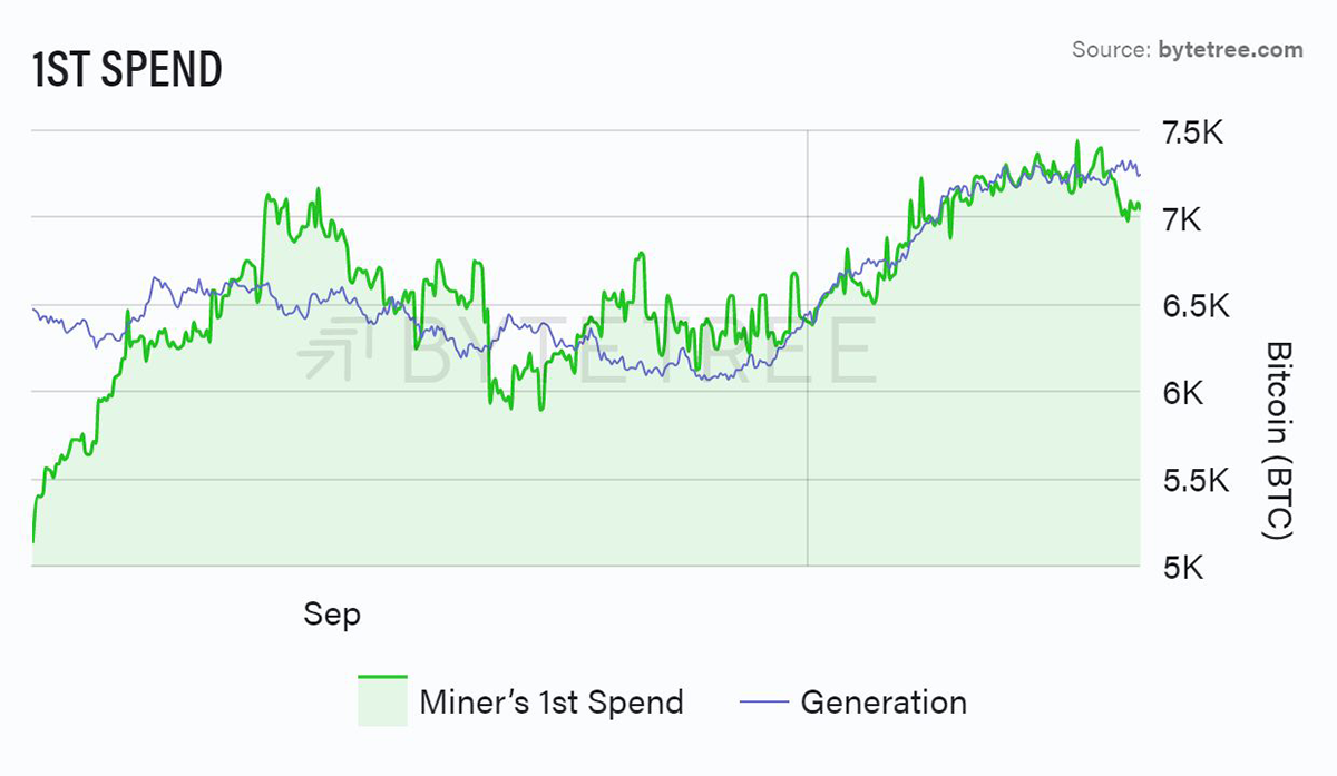 Source: ByteTree. New bitcoin supply entering the market (i.e. Miner’s 1st Spend) and generation of new bitcoins over the past 5 weeks.