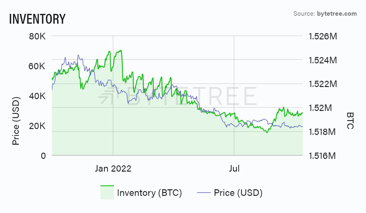 Source: ByteTree. Bitcoin miner unspent BTC inventory and bitcoin price (USD) over the past year.