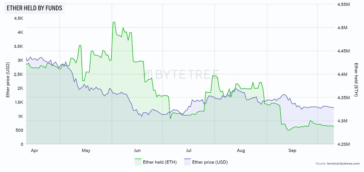 Source: ByteTree. Ethereum ETF flows (ETH) and the price of ETH over the past six months.