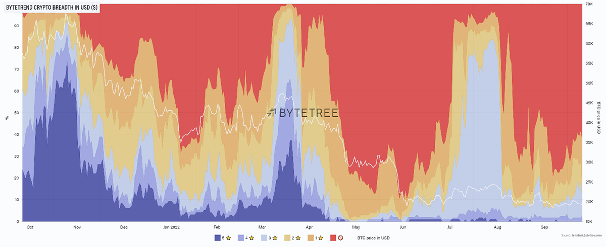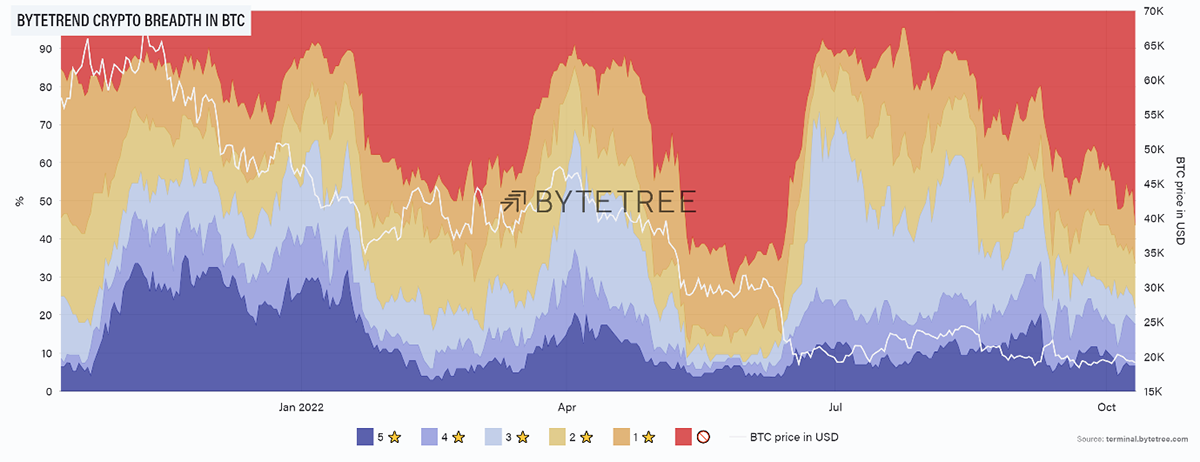 Source: ByteTree. ByteTrend breadth chart of the top 100 crypto tokens, measured in BTC, over the past year.
