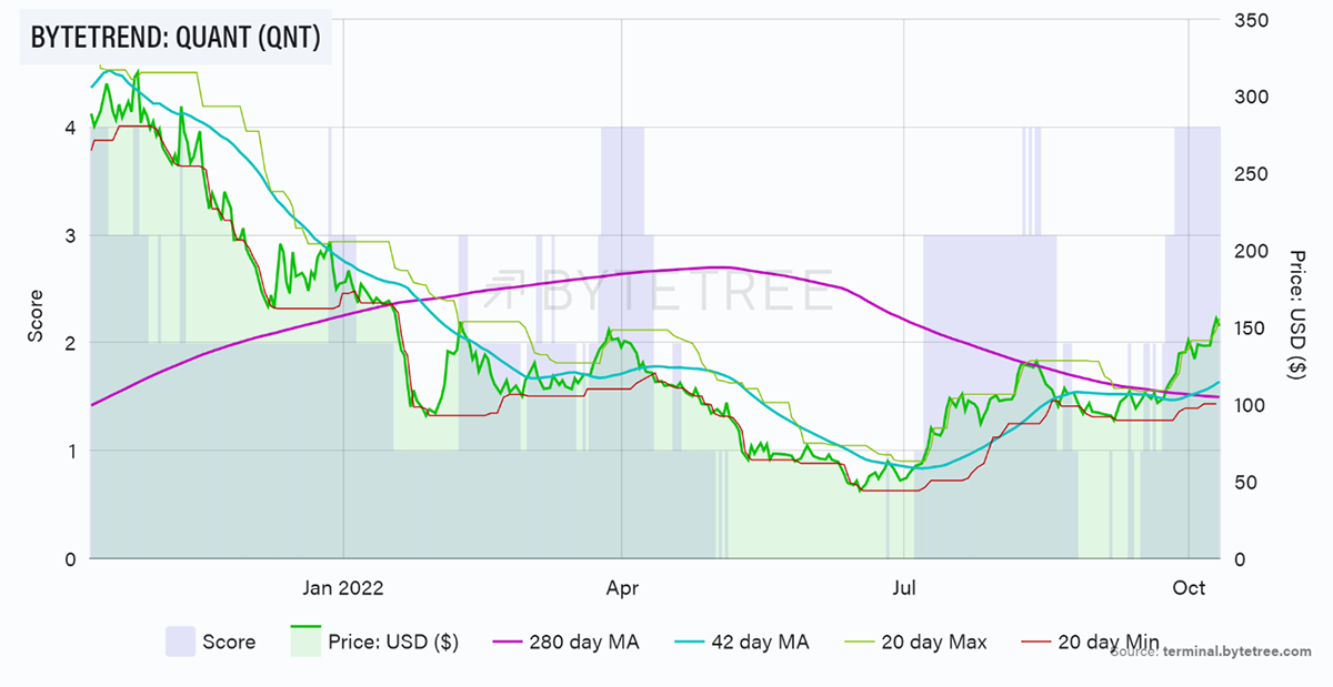 Source: ByteTree. ByteTrend chart for Quant (QNT), with the score in blue, measured in USD over the past year.