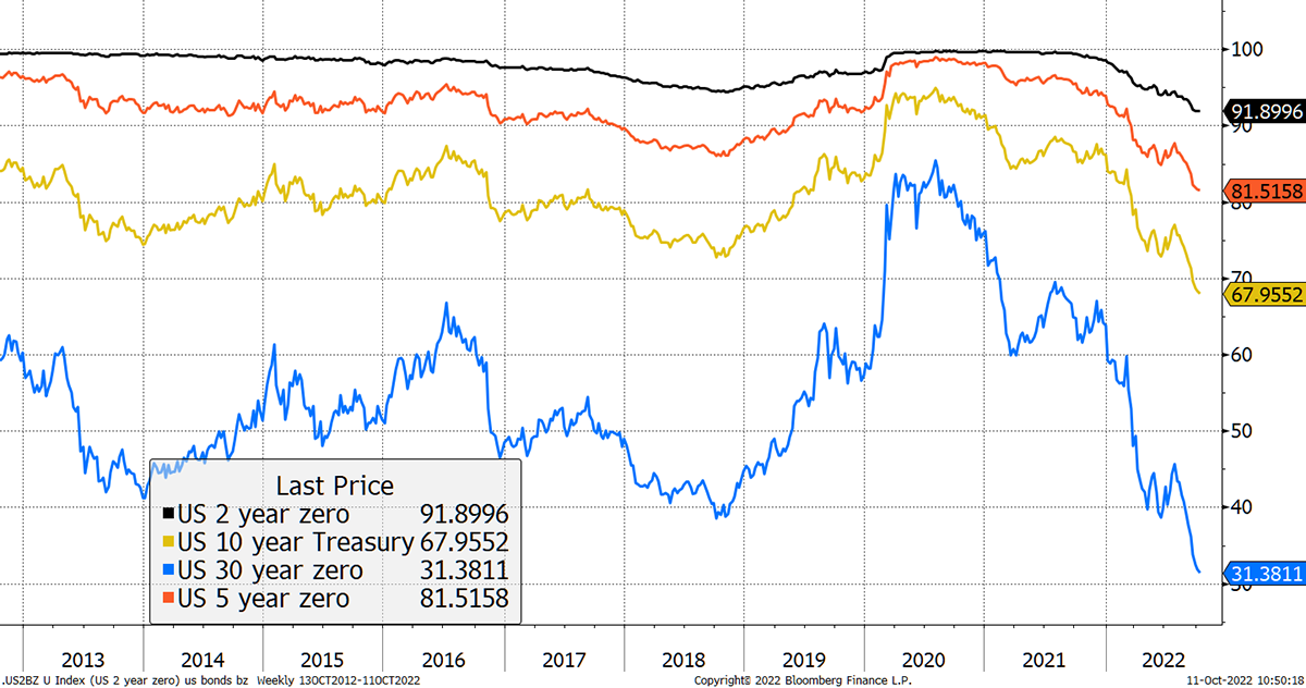 The carnage in bonds continues as interest rates surge. This is what the US bond market looks like, and it’s not the worst. Rather than show yields, I have shown prices. The US 30-year bond yield is 3.9%. You could buy a zero-coupon bond for $31 today that will redeem at $100 in 2052. But the harsh reality is that those who bought bonds two years ago have experienced severe capital losses.
