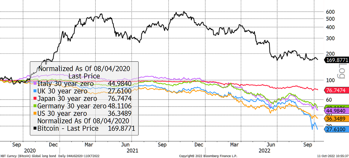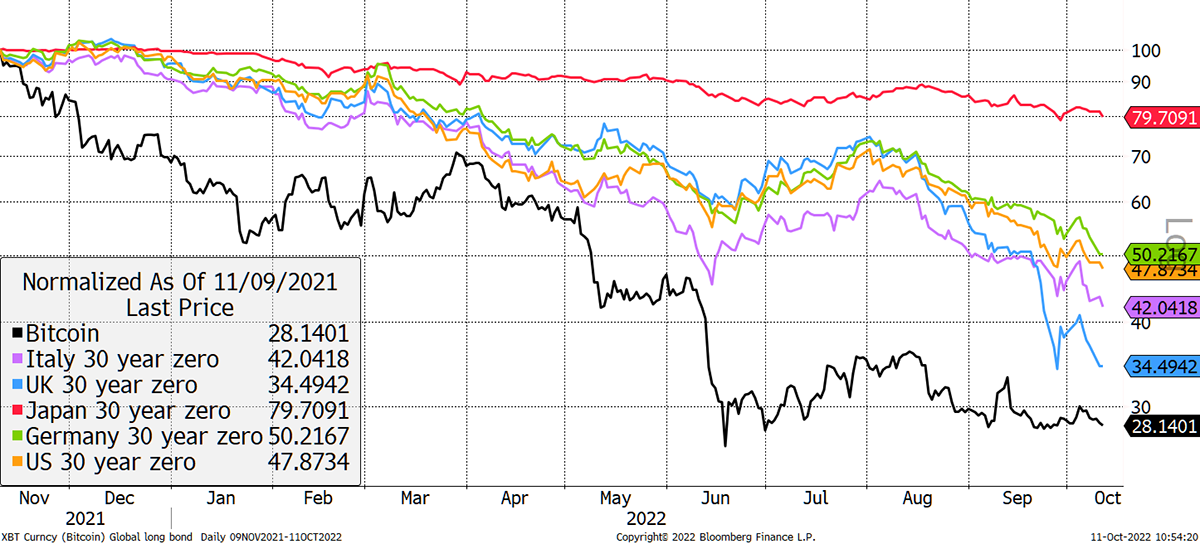 Bitcoin peaked on 9 November last year and is down 72%. A 30-year gilt wasn’t much better.