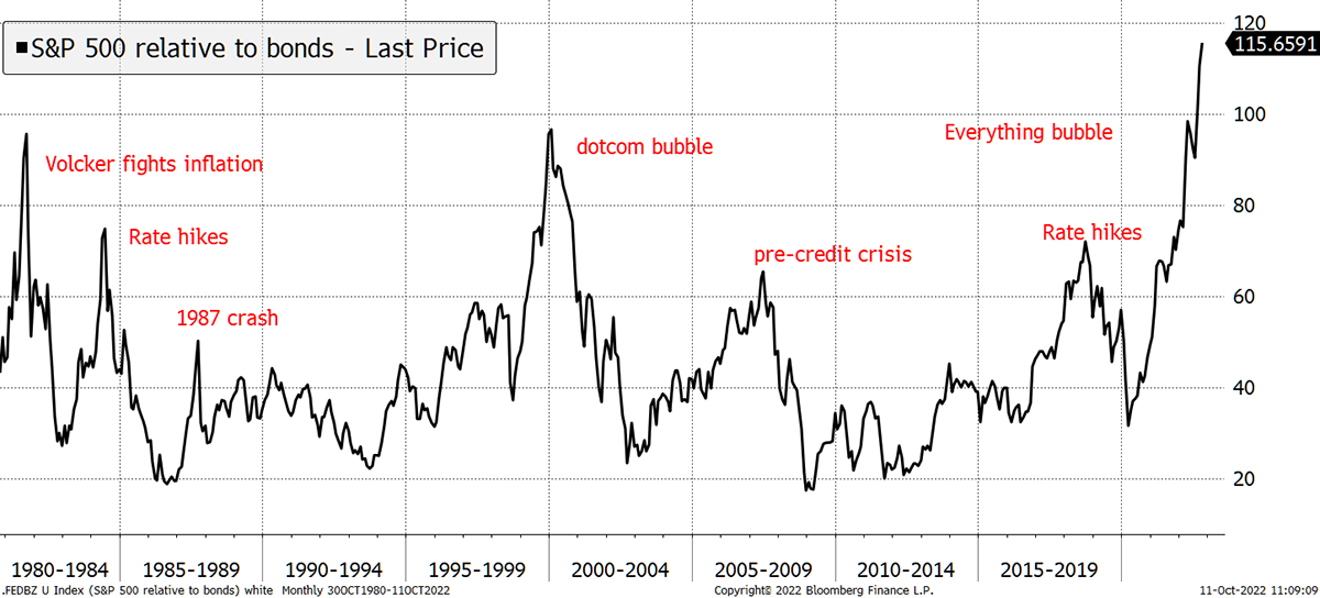 Stocks are only marginally below their June lows while bonds keep on falling. This equity to bond relationship is seriously stretched. I was concerned at 90, and now it’s 115. Think this through, and it’s frightening to think what might happen to equities.