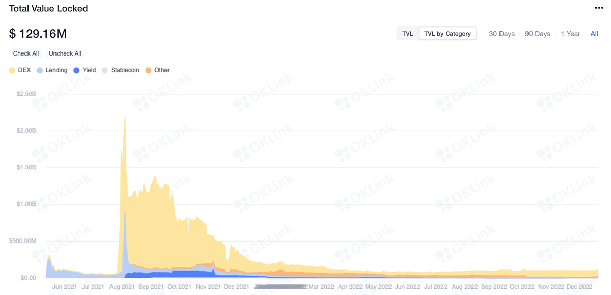 According to OKLink explorer, the network has processed over 130 million transactions, valued at over $65m at the current price. The network has just under 90 million addresses, of which only 2.7 million are active, and 3.6 million hold OKT tokens. Moreover, the network is considerably slow-running with a TPS of 0.46 and 3.8 seconds in average block time. The ecosystem’s total value locked (TVL) is around $129m, down from $2.1bn, its all-time high, on 4 August 2021.
