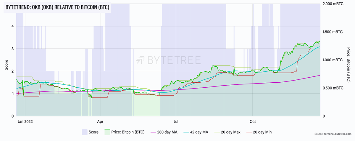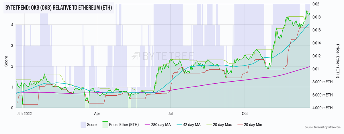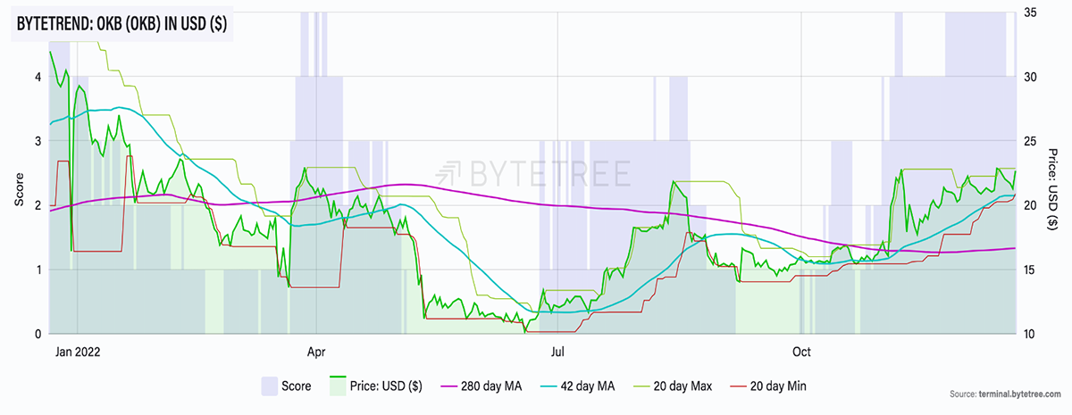 As illustrated by the ByteTrend scores, OKB has a strong bullish trend against all three major assets.