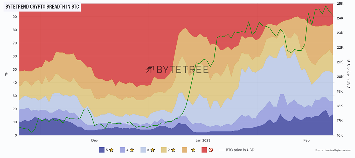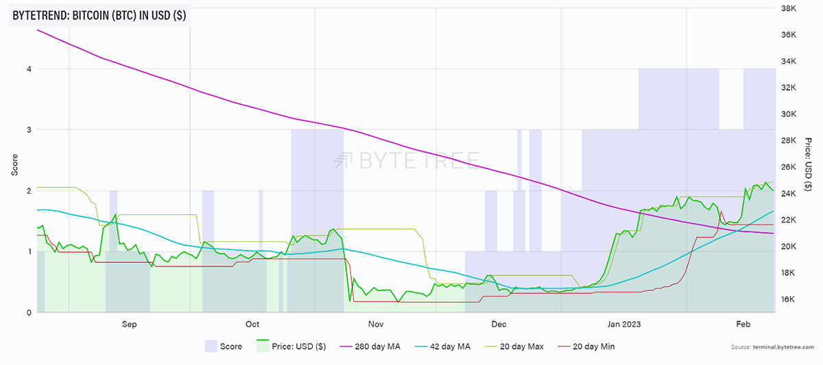 Bitcoin remains on a 4-star trend on ByteTrend, with the only star yet to be ignited being the 280-day moving average.