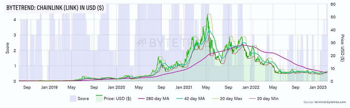 Chainlink was added back into ByteFolio this week and today upgraded to a 5-star (bullish) trend in US$ on ByteTrend.