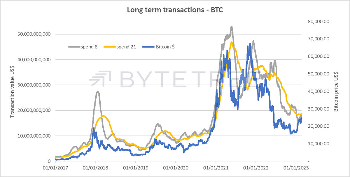 Also note that the 42-day moving average has crossed above the 280-day, sometimes referred to as a “golden cross”. This is a technically bullish signal and inclines us to believe that the US$21,000-22,000 level will act as strong support.