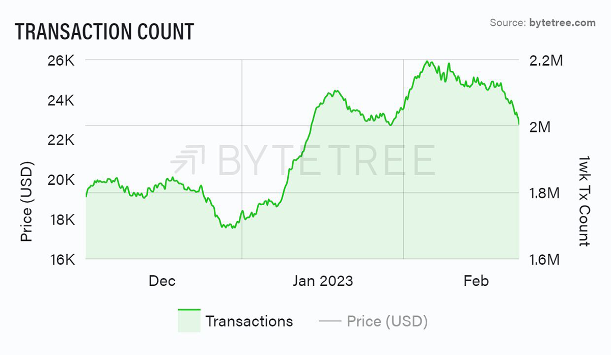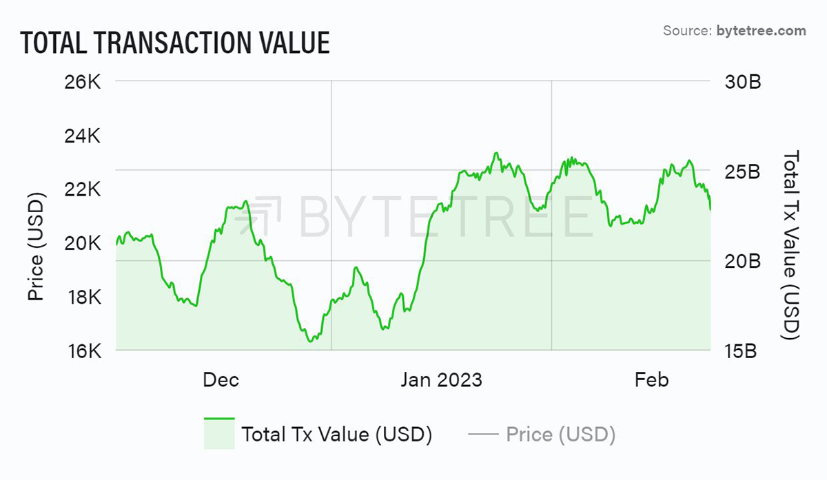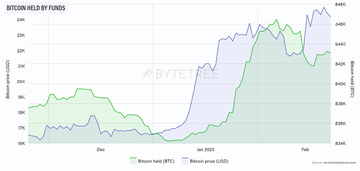 Fund flows indicate that there was a small amount of profit taking in the middle of February, but that has been easily absorbed. The price has rallied sharply from the mid-month dip to around US$21,600, and with it there has been a small recovery in fund ownership.