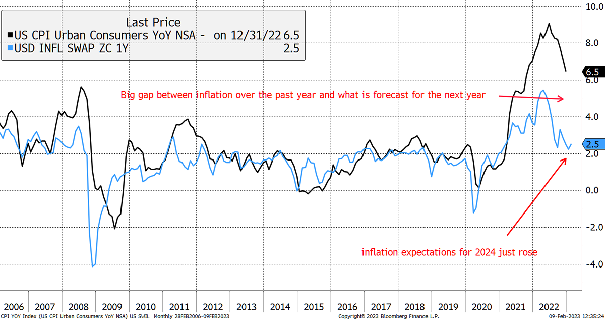 Normally we see inflation over the past year looking very similar to the forecast for next year. This has been true outside of periods of high macroeconomic uncertainty. For example, in 2008, inflation fell sharply, which was preceded by collapsing forecasts. They subsequently recovered in 2009, which not only preceded inflation but turned out to be a buy signal for the stockmarket.