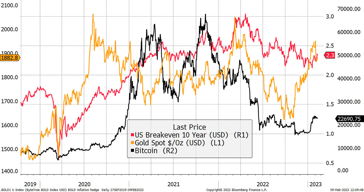 We are told that bitcoin and gold are inflation hedges, and I agree they are. That means their prices rise in response to, or anticipation of, inflation. The trouble is timing. Looking at gold (gold) and bitcoin (black) against inflation forecasts (red), and it’s a mess. Gold led inflation in 2020, which led bitcoin, yet both assets cooled in mid-2022. In any event, it’s hard to make sense of what’s what.