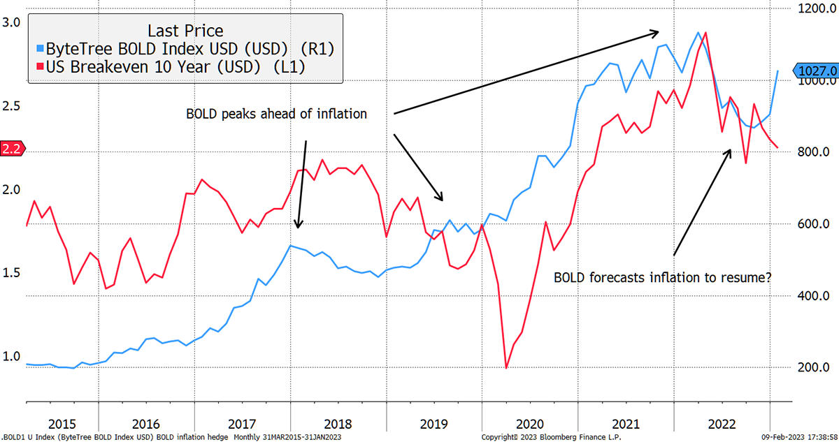 This equal-risk approach brings about financial magic. Gold is a risk-off asset in contrast to bitcoin, which is risk-on. In the BOLD blend, this interference disappears, and the result is something that is remarkably closely linked with changes in inflation. The trouble is that BOLD just had one hell of a month, surging 13.7% in dollars, while volatility remained just 15%. If BOLD is a leading indicator, that means inflation expectations are too low.