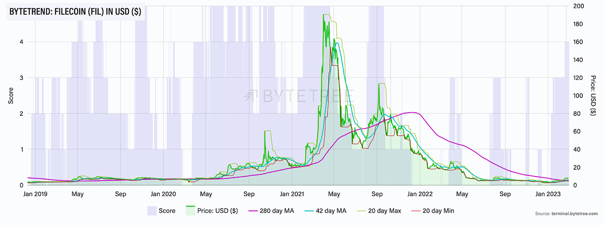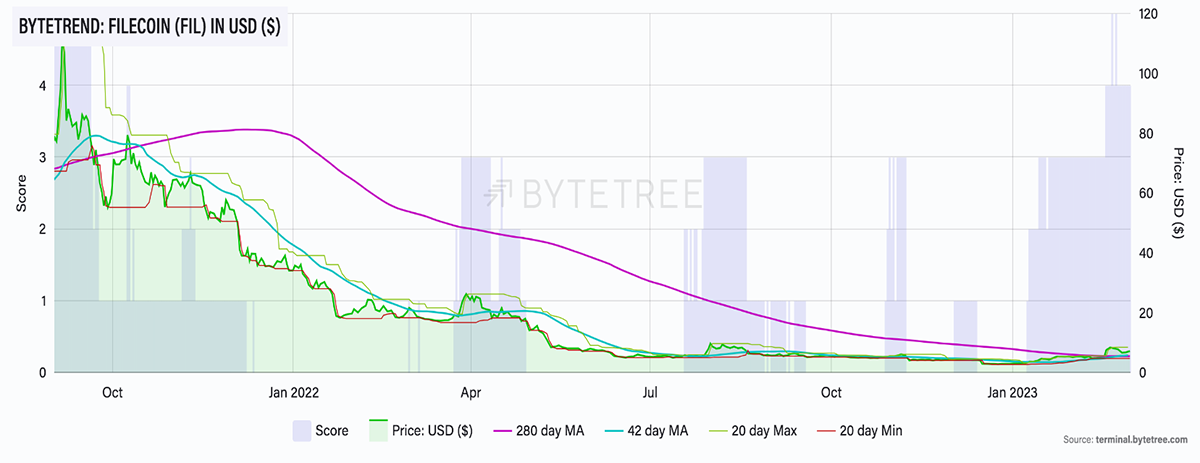 However, as we can see in the above charts, after dropping 99% from its all-time high, FIL started this year with a 120% gain. It also has recently scored a 5-star trend in USD on ByteTrend for the first time since September 2021.