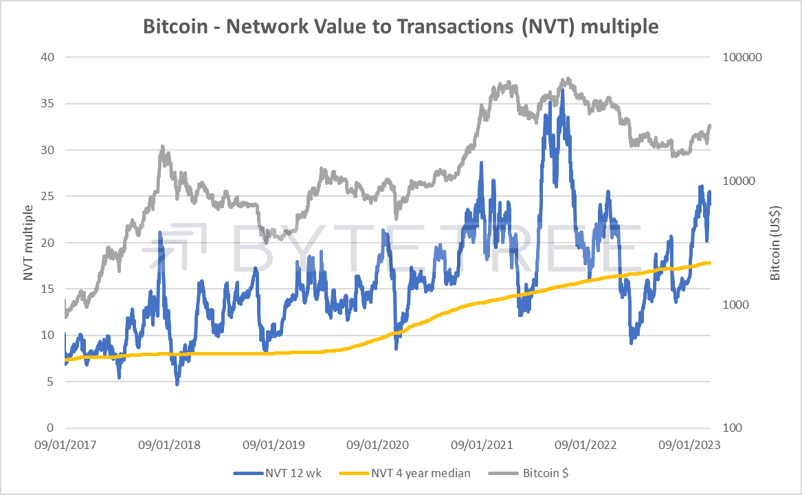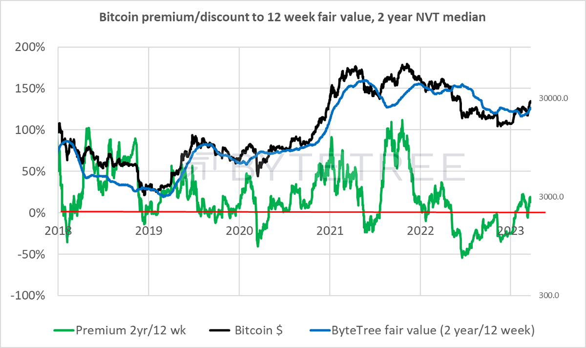Our internal fair value sits at around US$24,100. We’re using the 2-year median multiple to reach the fair value, which puts BTC at a mild premium.