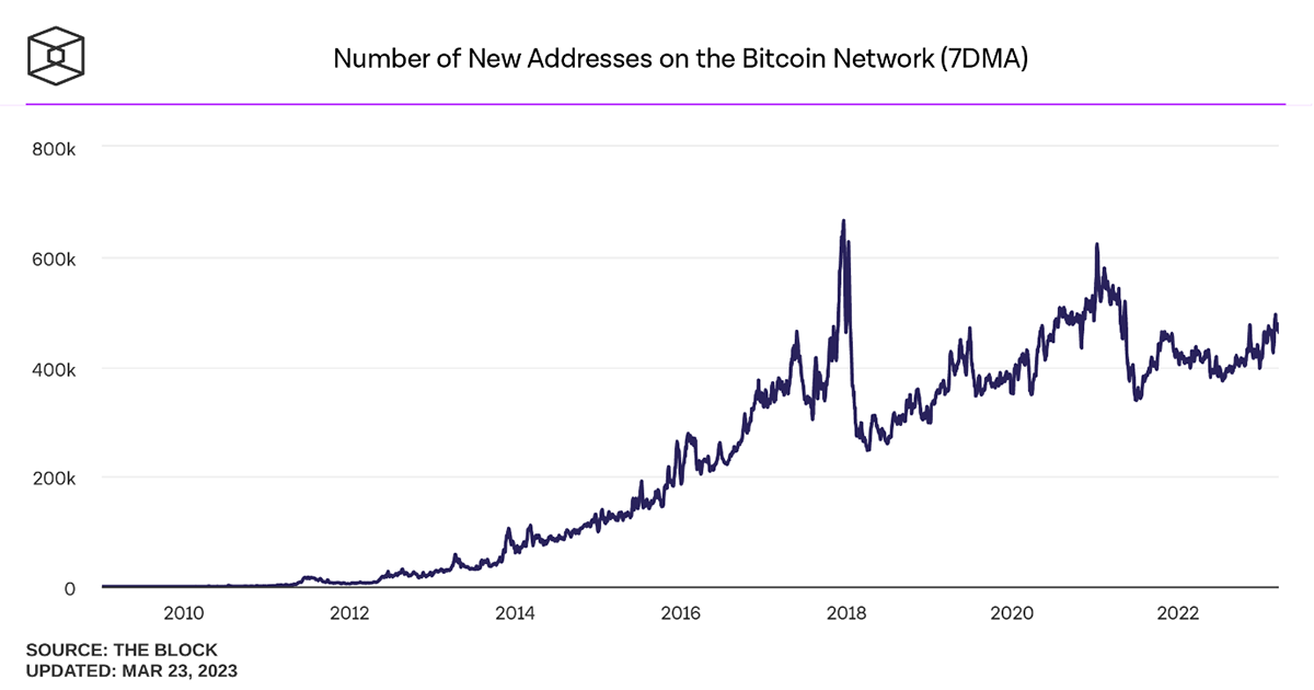 At this point, we want to see a continued pick-up in network activity and evidence of increasing adoption. The number of new addresses on the Bitcoin Network shows a steady, but far from spectacular, appreciation.