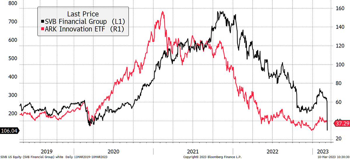 Silicon Valley Bank (SVB) has been funding the technology and life sciences sectors. These have been the engine of growth but now lack cash flow as times get tough. As a result, SVB appears to have been selling assets to boost capital and cover losses, but with asset prices down, confidence has waned. The bank’s fortunes have been closely aligned with the tech sector, which can be seen from the close resemblance to the infamous ARKK ETF.