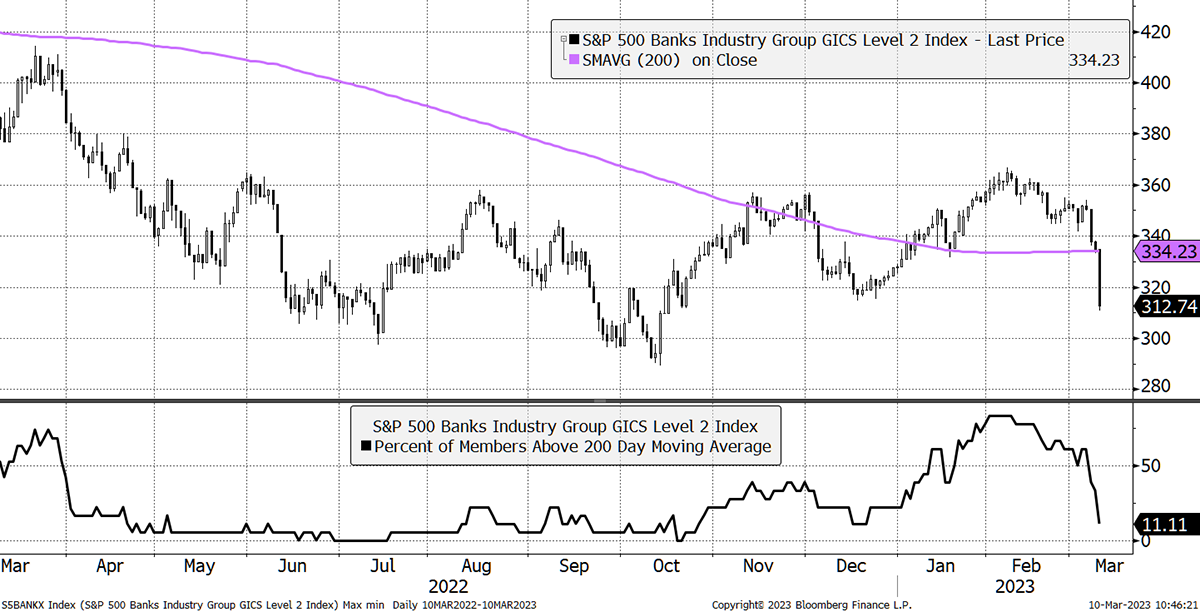 SVB’s stock fell 60% yesterday, which spooked the broader banking sector, one of the strongest sectors this year. In a few market sessions, the US bank sector has cut straight back down through its 200-day moving average, with breadth collapsing. That happened just as investors were beginning to believe that the banks offered sanctuary. After all, they benefit enormously from interest rate hikes (which they fail to pass on to their customers).