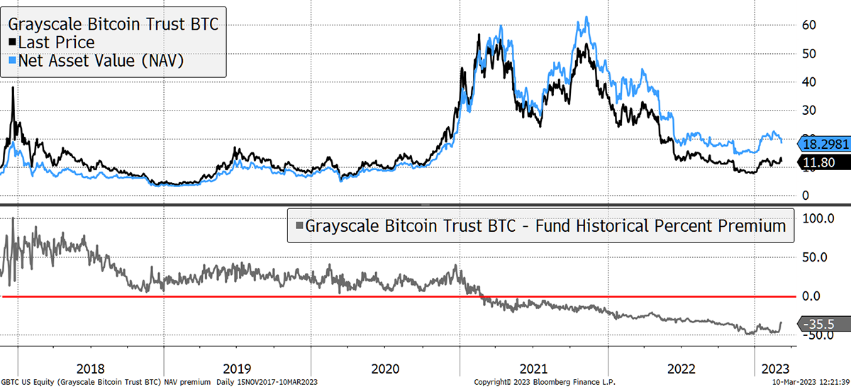 ATOMIC this week highlighted the many positives on the Bitcoin Network. While the blockchain is alive and well, the broader crypto sector faces banking problems of its own as Silvergate Bank has moved into voluntary liquidation. There are also developments at Grayscale, which has sued the SEC for rejecting an application to convert its closed-end fund (GBTC) into an ETF. The GBTC discount to NAV has narrowed from a low of 49% to 35% in short order.
