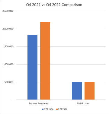According to a recent report published by Render, the overall network usage grew by 10% from Q3 to Q4 2022, with an increase of 5% in user retention. The total frames rendered have also seen significant yearly growth in 2022 (9.4 million) compared to 2021 (5.9 million). Additionally, the network has experienced many scalability improvements, resulting in a 50% reduction in failure rates and a 50-75% increase in performance.