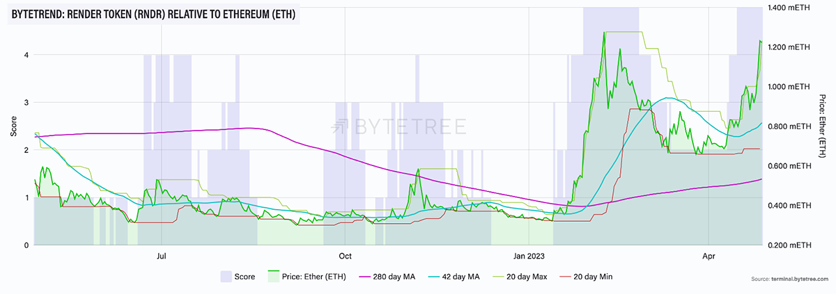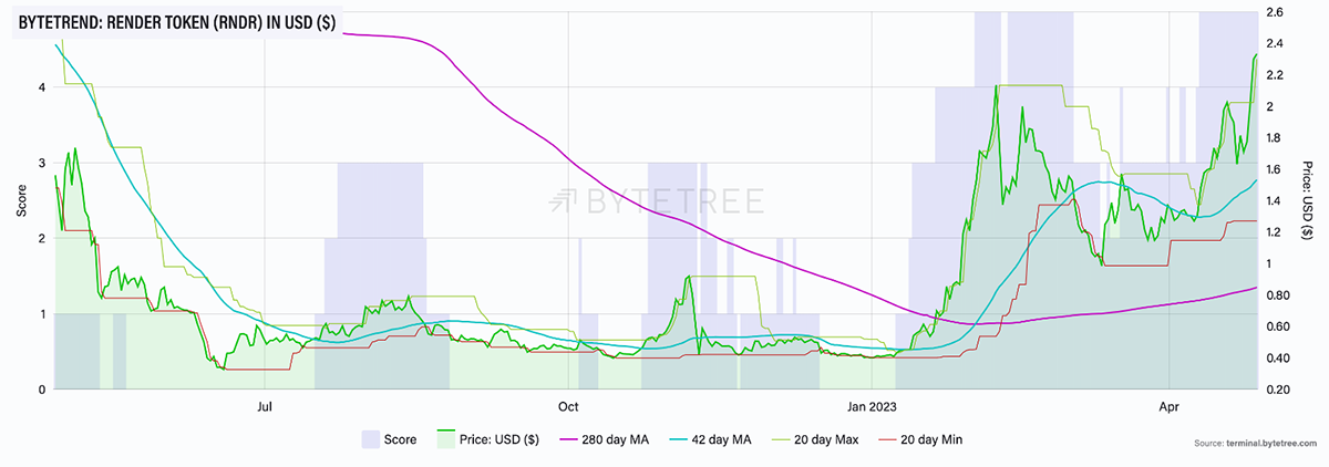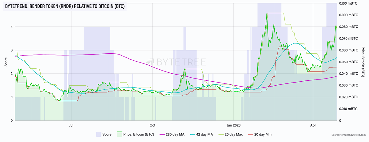 As illustrated in all the three charts above, RNDR is currently scoring a 5-star ByteTrend in USD, BTC and ETH, showcasing a strong bullish trend against the three major assets.