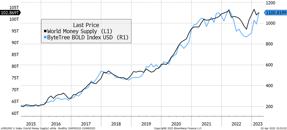 Speaking of portfolio diversifiers, the monthly Bitcoin and Gold Chart Book was published this week. What is fascinating is that, looking at bond positioning, a deflationary outlook is now the consensus. The idea that inflation might linger is contrarian. And yet history tells us that inflation can be highly volatile in periods of uncertainty. The risk in markets is surely that there is a sharp slowdown without inflation having been defeated. If that is the case, do politicians reach for the easing/printing button, or do they maintain their resolve and watch things come unstuck? We suspect the former, in which event these two assets will thrive. The correlation of our BOLD strategy with the world money supply, shown below, speaks for itself.