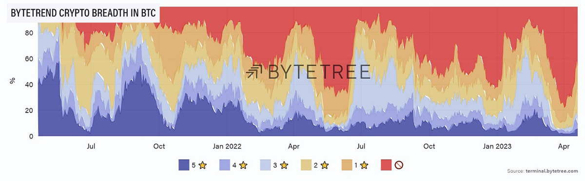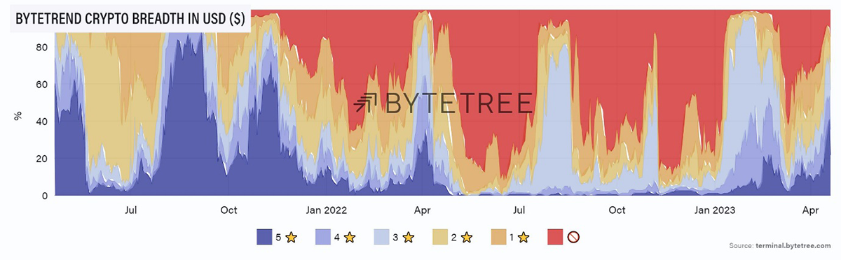 In US$ terms, crypto is now as strong as it’s been since November 2021. That can be seen in the breadth chart below, where the ByteTrend 5-star ratings (dark blue) have risen substantially. It corroborates our belief that the winter is over.
