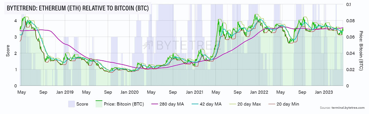 Interesting things are happening with ETH at the moment following the Shapella upgrade. Its price relative to BTC has been stuck in a range for over a year, as shown by the 280-day moving average below. But that moving average is tentatively starting to slope upwards. ATOMIC is sceptical about any imminent return of frenzied altcoin behaviour but will give credence to the idea that ETH can start to show some form.