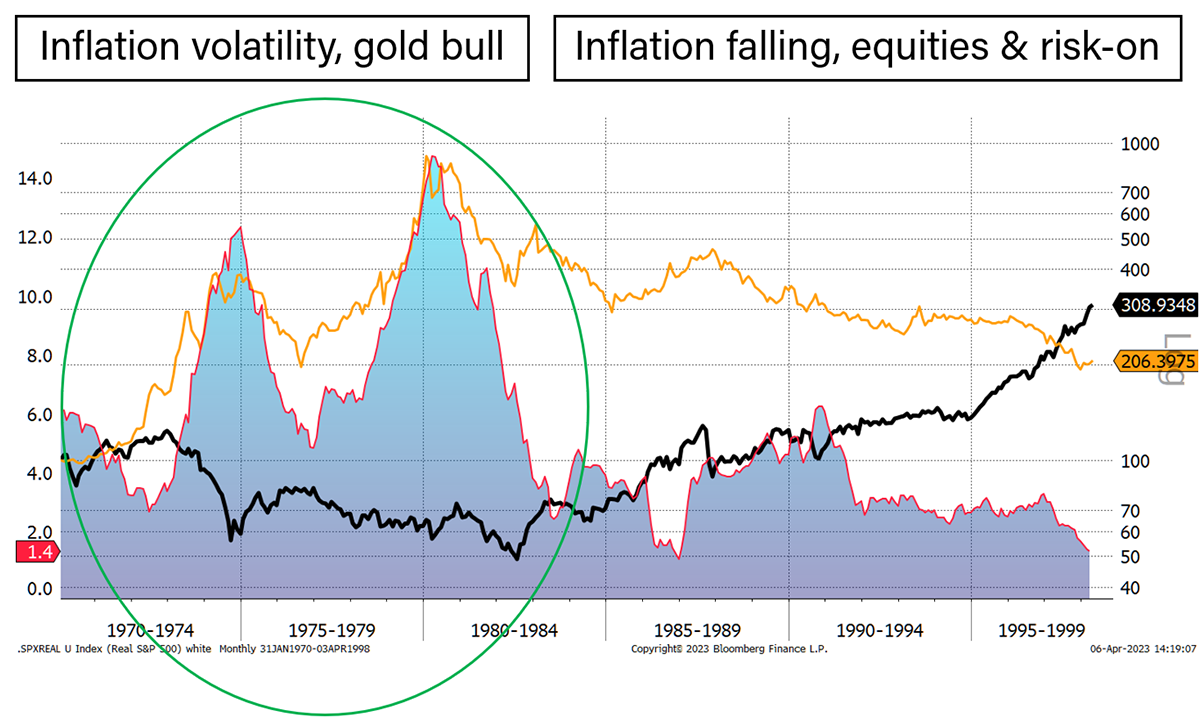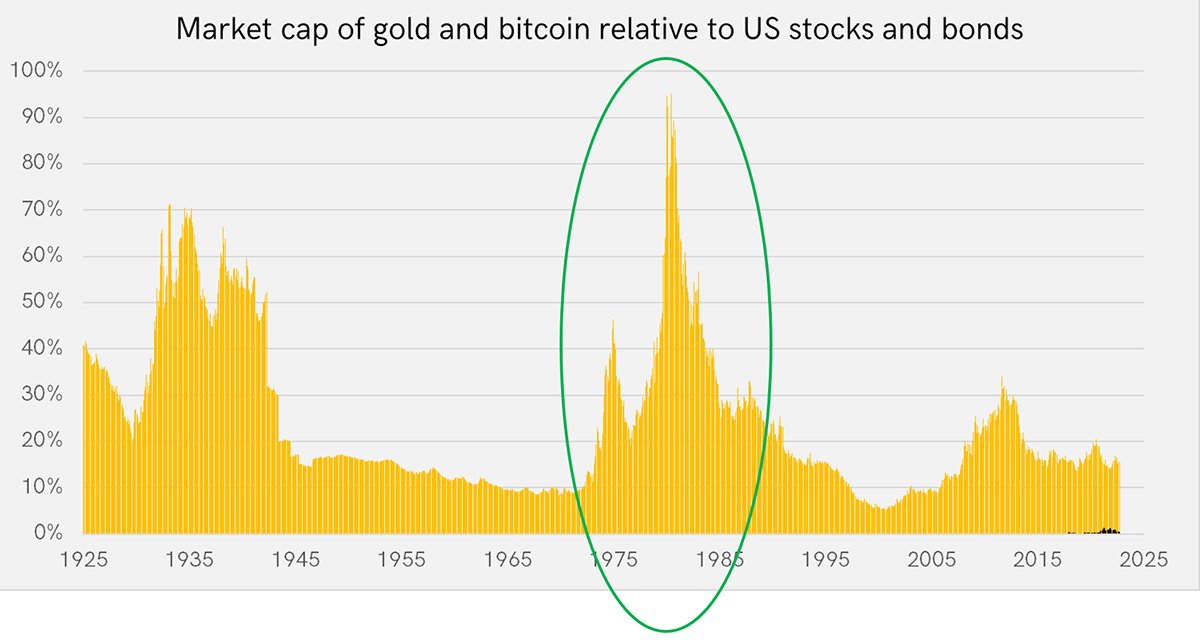 I’m indebted to Charlie Morris for providing the following charts, which show how important gold became in the investment mix during the days of high inflation volatility in the 1970s. The first picture shows how gold soared in price during that decade (it took 27 years for the S&P500 to catch up). The second shows how high gold grew as a percentage of stocks and bonds in that period (circled). If we are back in a period of high inflation volatility – as many, including ourselves, believe – this is an important reminder of the role that alternative assets play. And very few are prepared for this.