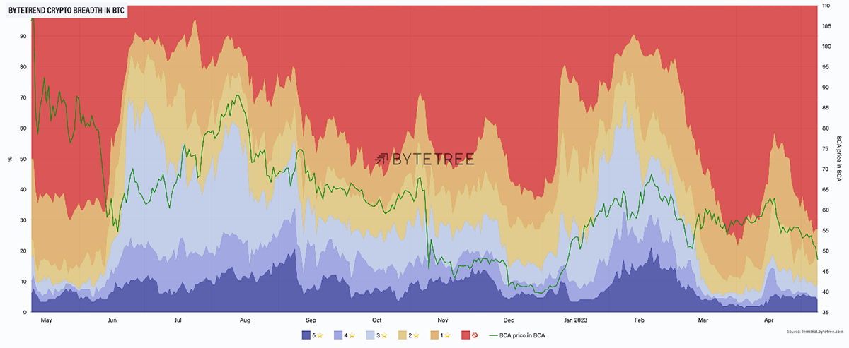 It probably goes without saying, but because crypto is speculative, its price patterns are supremely important. Constant price erosion will gradually take traders out of the game. That is why we constructed ByteTrend, not just as a way to generate ideas but also to act as a risk tool. And the risk tool says to stay on the sideline, as far as altcoins are concerned.