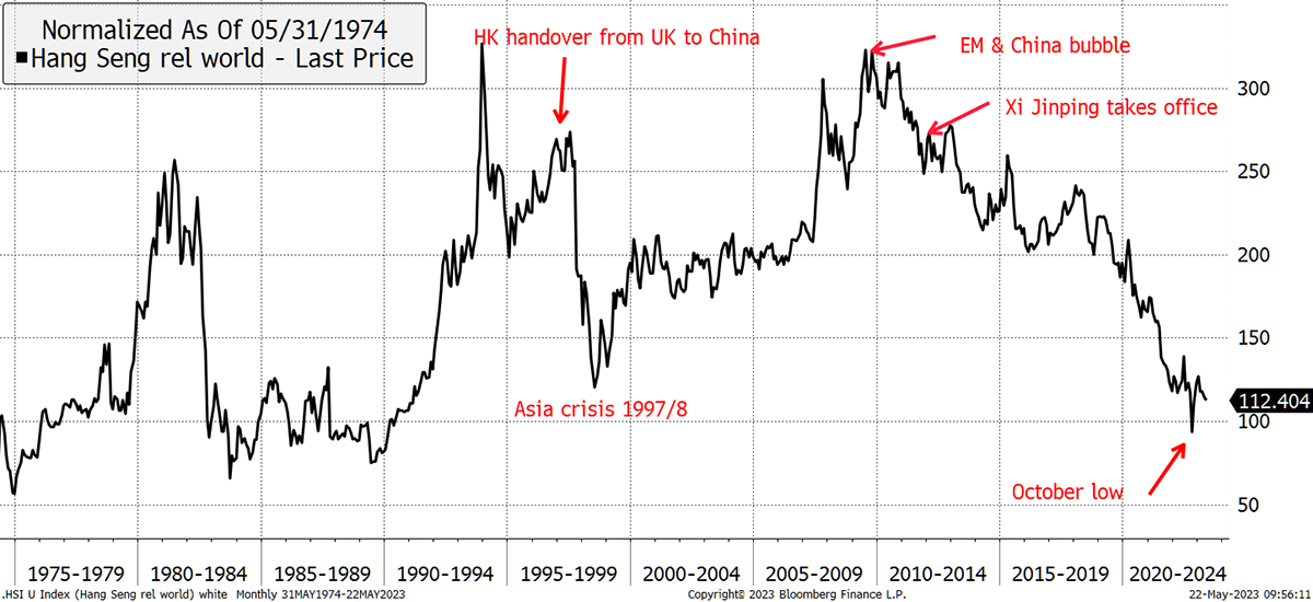 Hong Kong’s Hang Seng Index (HSI) reminds us of the ups and downs of investing in Asia. Hong Kong was truly an economic miracle, and from the mid-1970s to the mid-1990s, the HSI did 3x better than global equities. The British shouldn’t take credit for the growth, but they should be proud of their system of governance that provided fertile conditions for what followed. Unlike the UK, HK maintained a small government, and the results were spectacular.