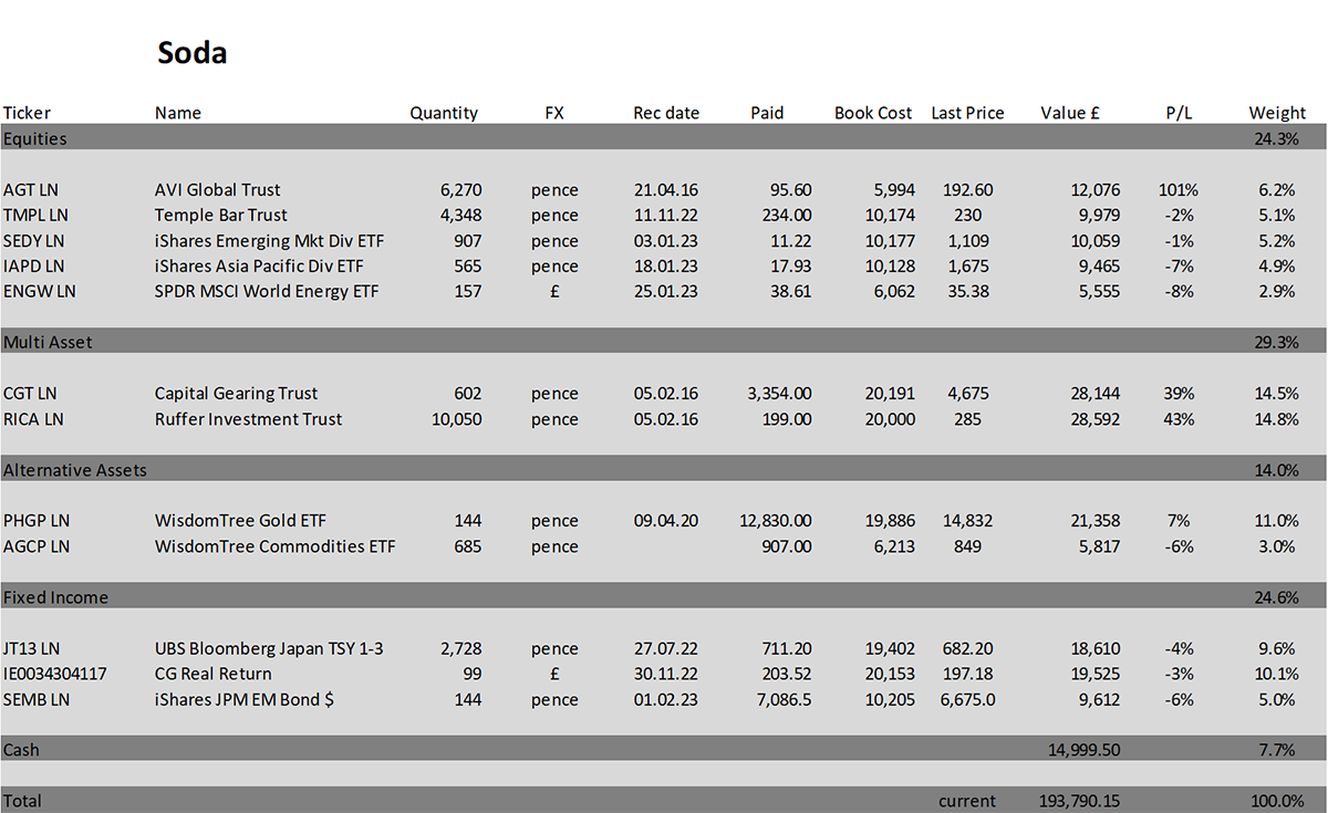 Soda - a long-term, low turnover portfolio investing in funds, exchange-traded funds (ETFs) and investment trusts (including Berkshire Hathaway). The Soda portfolio is down 3.2% this year and is up 93.8% since inception in January 2016.