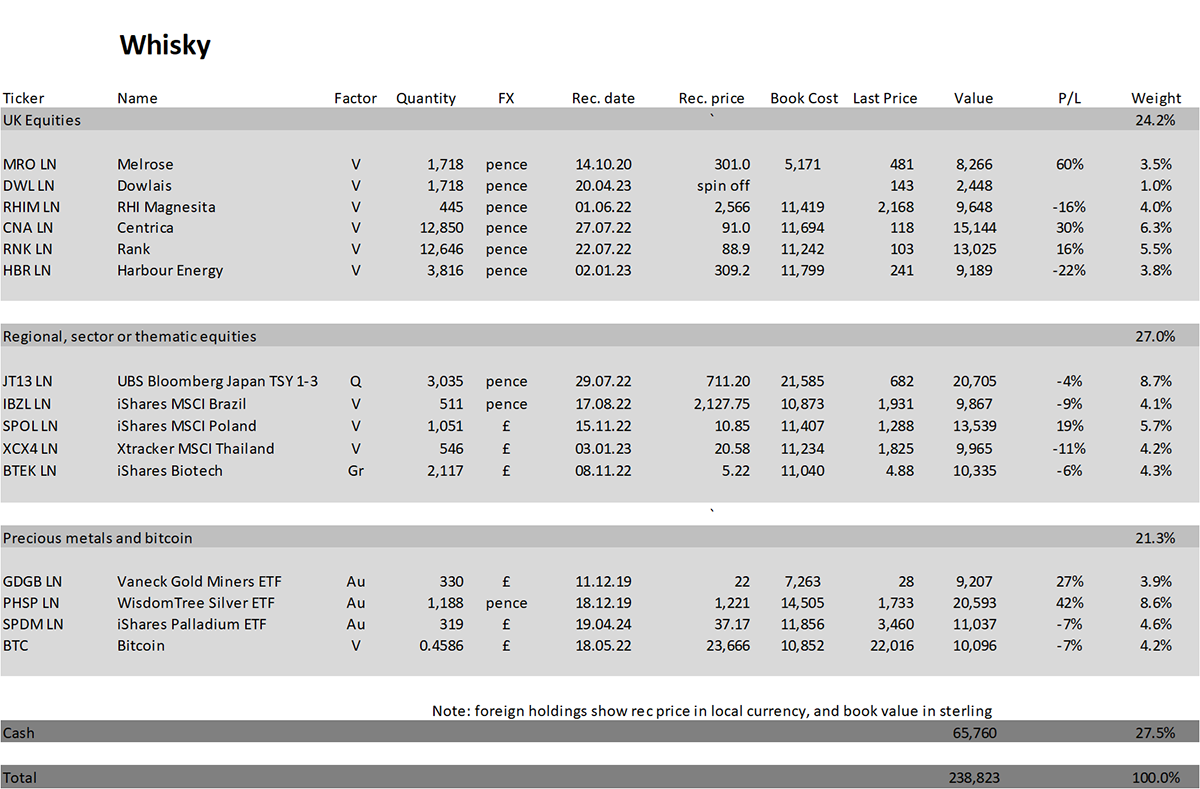 Whisky - a tactical, actively traded portfolio investing in stocks in the FTSE 350 Index, investment trusts, global ETFs and bitcoin. The Whisky portfolio is up by 6.9% this year and up 138.8% since inception in January 2016.